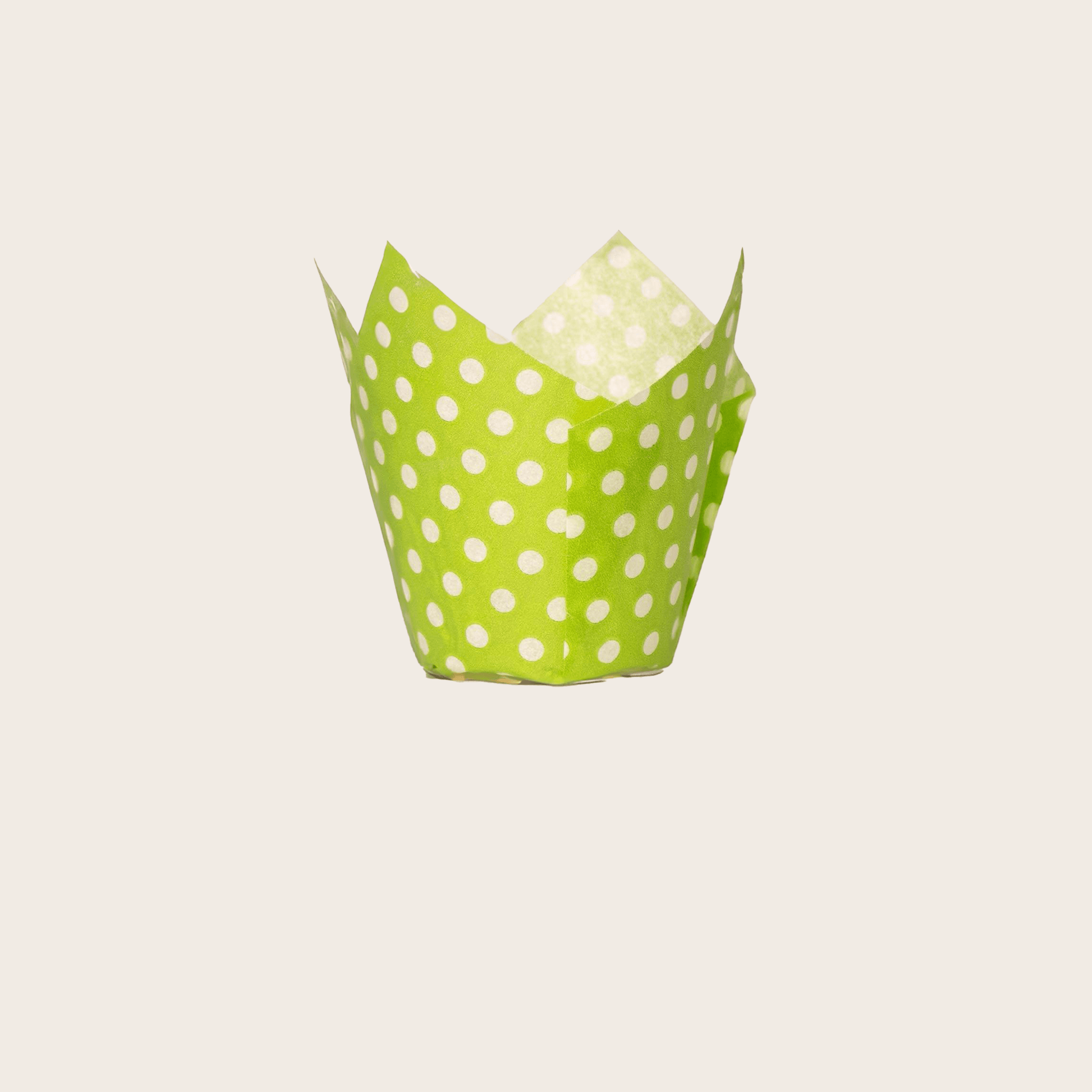 Хартиени чашки за печене предназначени за производство на мъфини, но са подходящи и за други видове тесто. Чистата целулозна хартия е устойчива на хранителни мазнини и може да издържи на замразяване и печене до 220°C. Тези чашки за печене са рециклируеми и трябва да се поставят в допълнителни форми за печене. Елегантният дизайн във формата на лале от зелена хартия с бели точки ги прави подходящи за представяне на готовия продукт